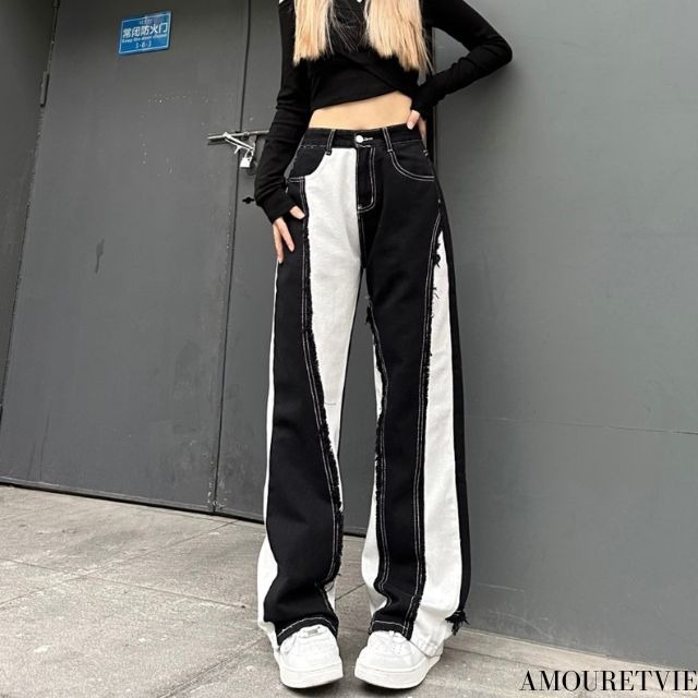 白黒のモノトーンカラーがかっこいいボトムスが登場。ダメージ加工が施しており、ビンテージ感がおしゃれのアクセント。