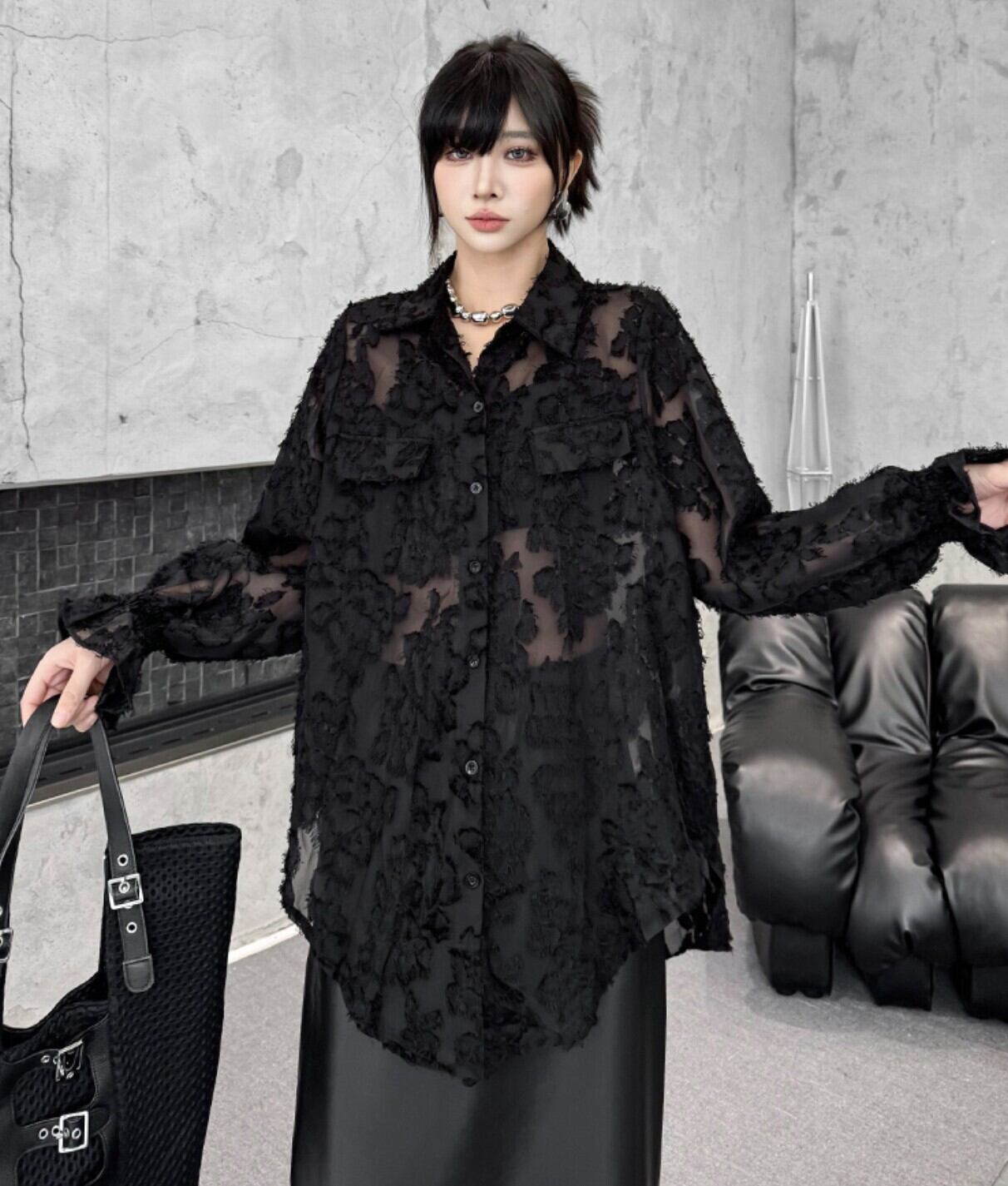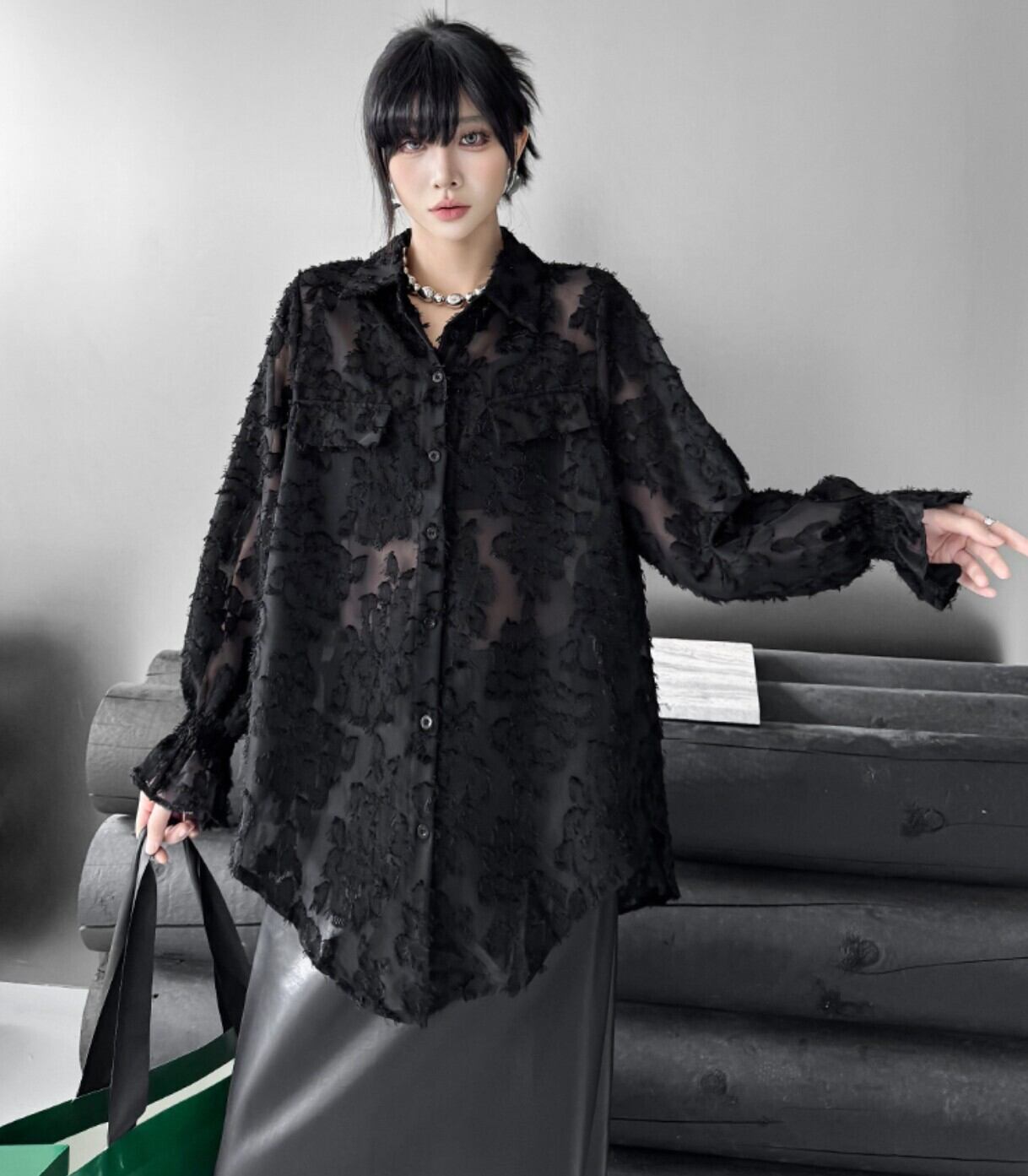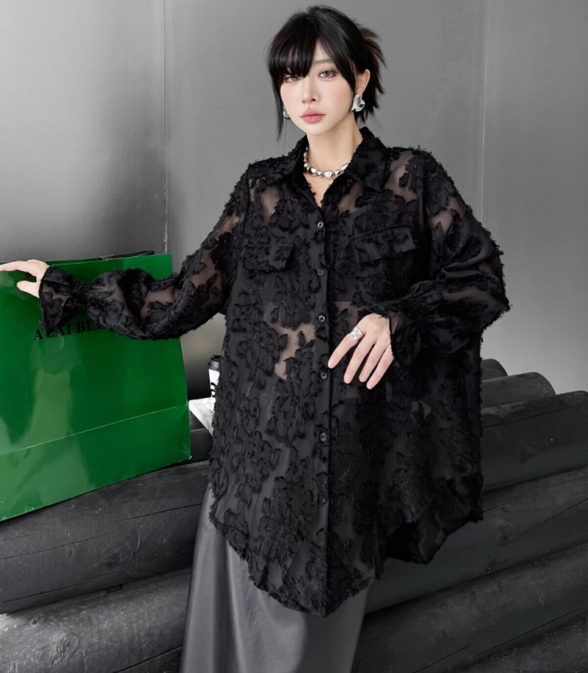#シアーシャツ #オーバーサイズ #ブラック #フロッキー #花柄ジャカード #韓国ファッション #モード #透け感 #レイヤード