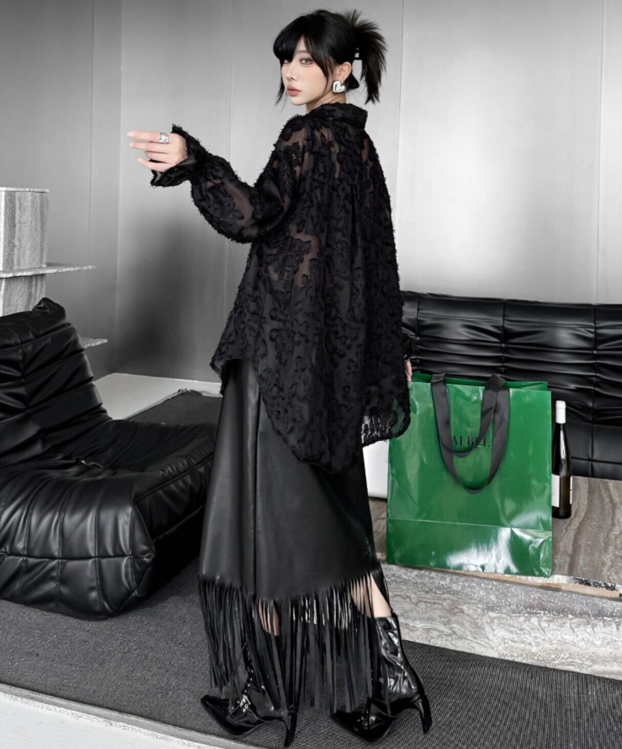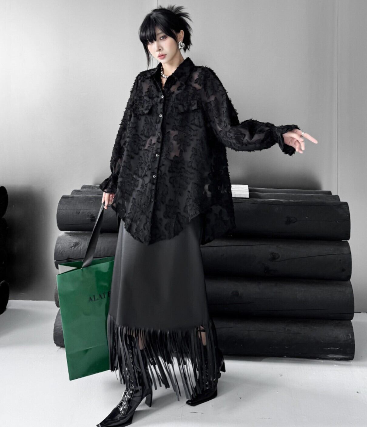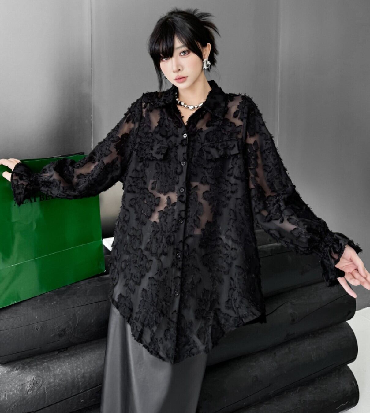 #シアーシャツ #オーバーサイズ #ブラック #フロッキー #花柄ジャカード #韓国ファッション #モード #透け感 #レイヤード
