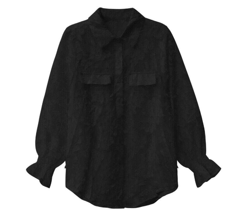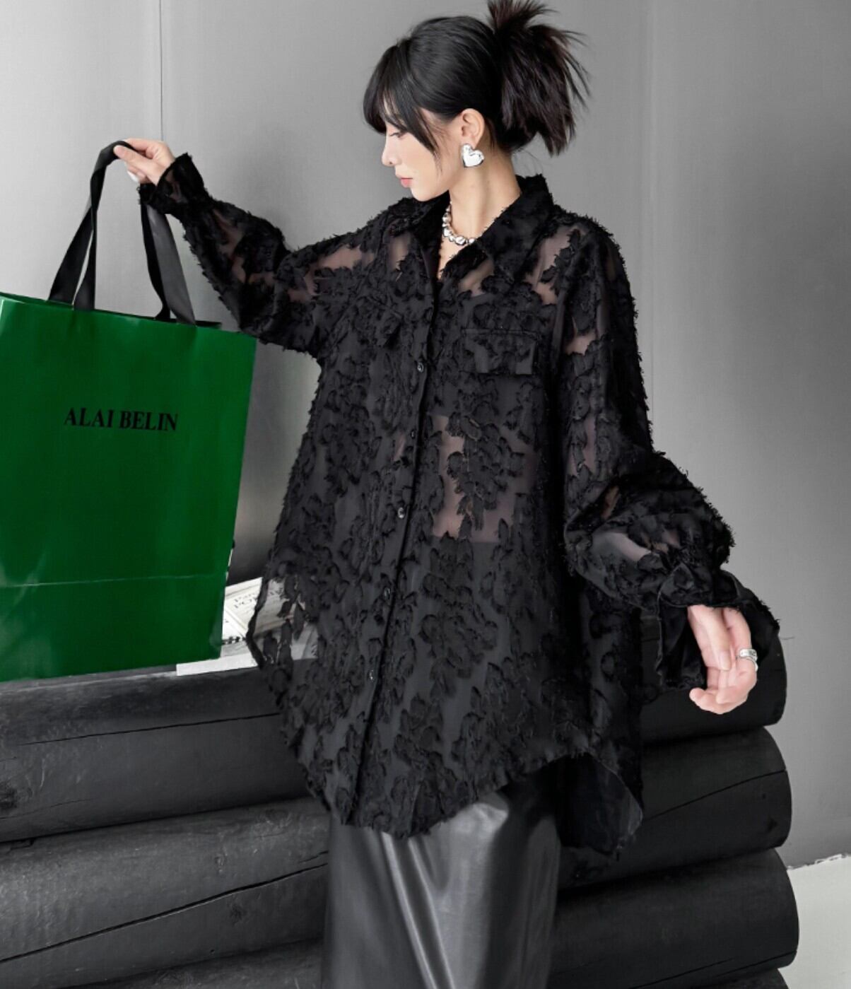 立体フラワージャカード シアー/透け感 オーバーサイズシャツ 黒 長袖|韓国モード|NEIRA