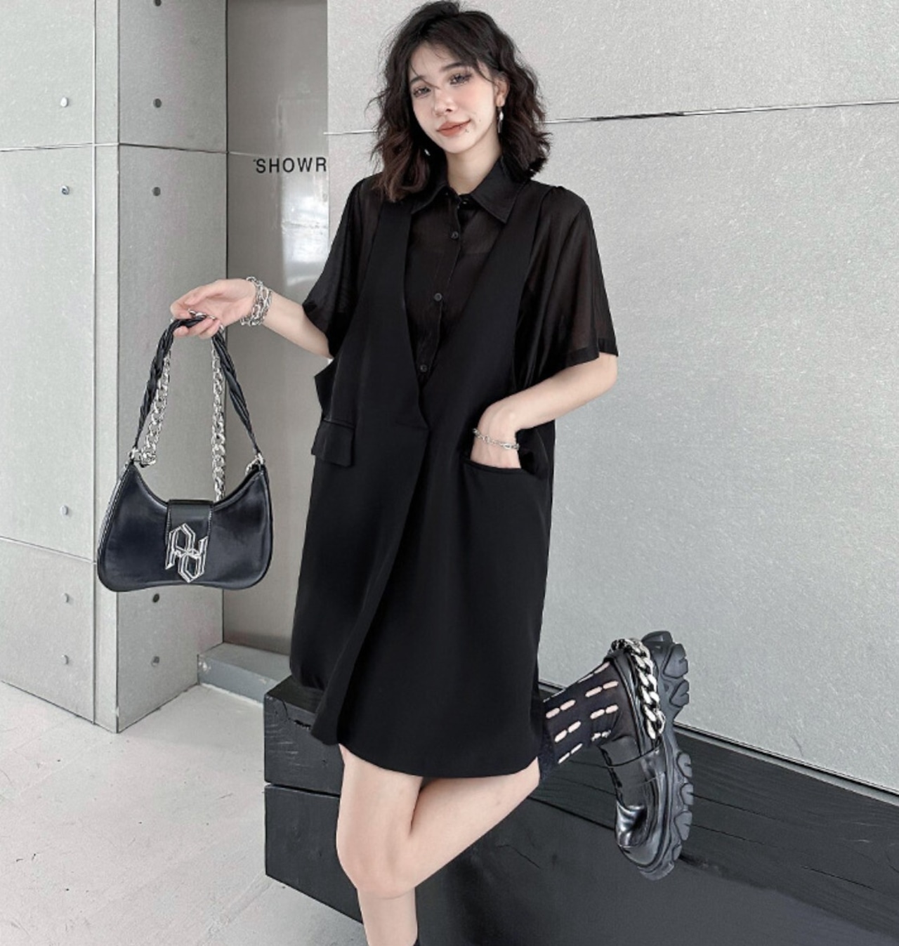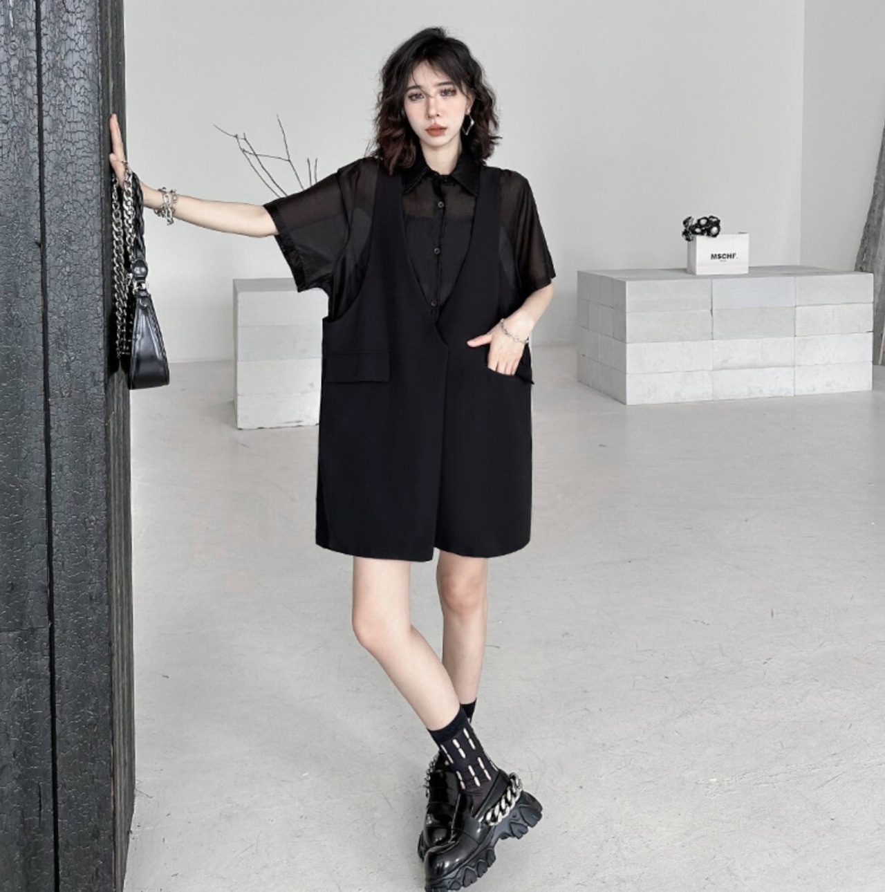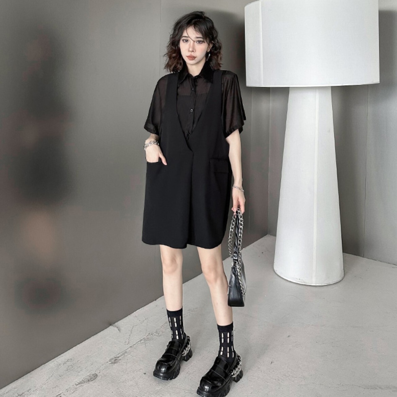 #レイヤードワンピ #フェイクレイヤード #シアー #ベスト風 #ジャンパースカート #ブラック #韓国ファッション #モード
