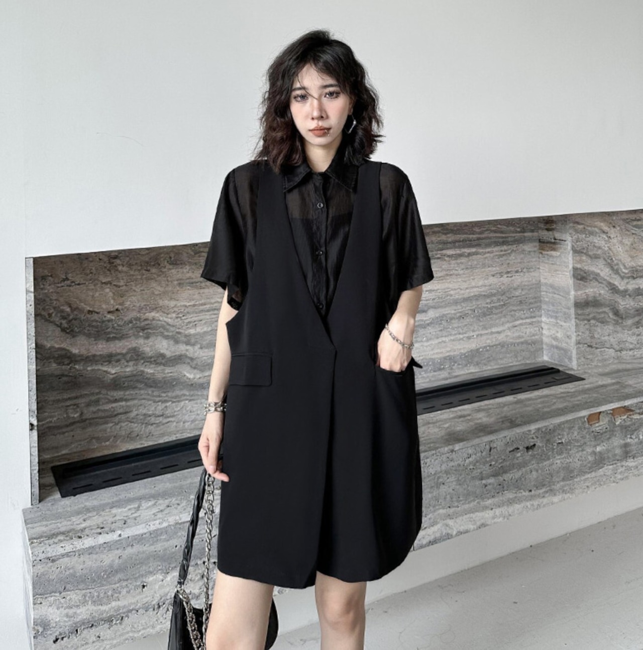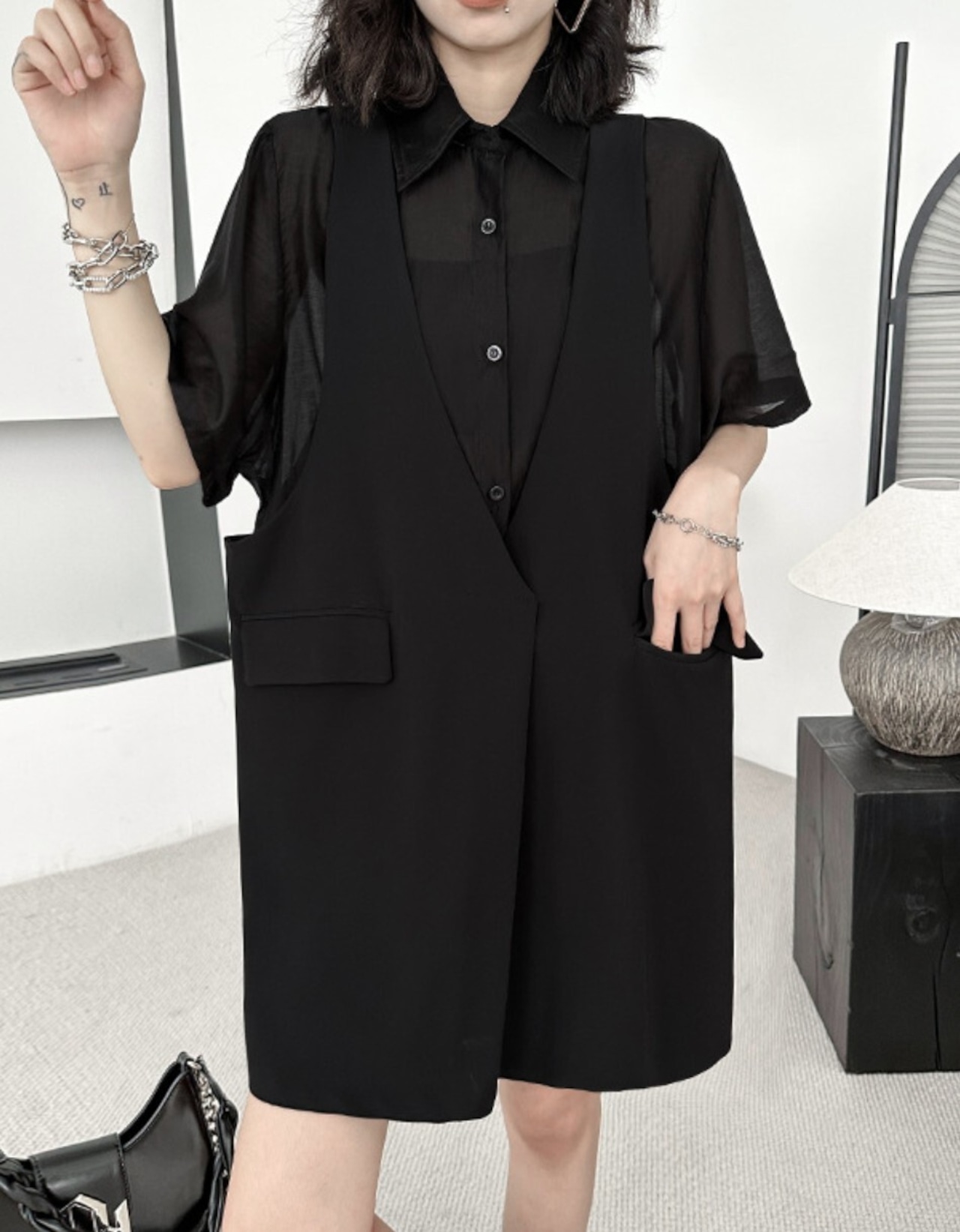 シアー半袖シャツ×ベスト風 フェイクレイヤードワンピース 黒 ミニ/膝丈 深V|韓国モード|NEIRA