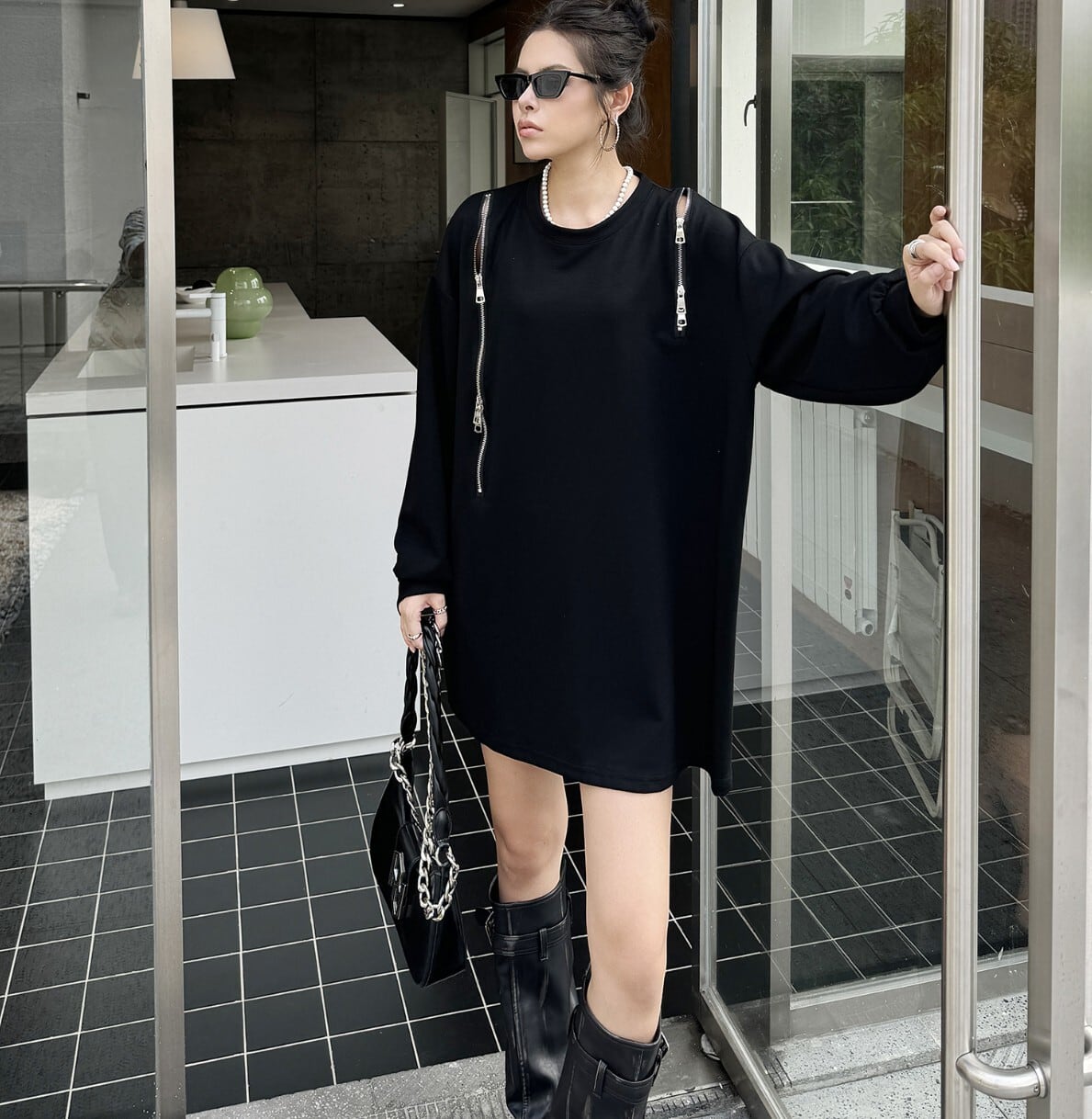 #NEIRA #スウェット #スウェットワンピ #ミニワンピ #ロングトップス #オーバーサイズ #ショルダーZIP #ドロップショルダー #レオパード #ヒョウ柄 #ブラウン #ブラック #モードコーデ #韓国モード #ストリートMIX #長袖 #レイヤードコーデ