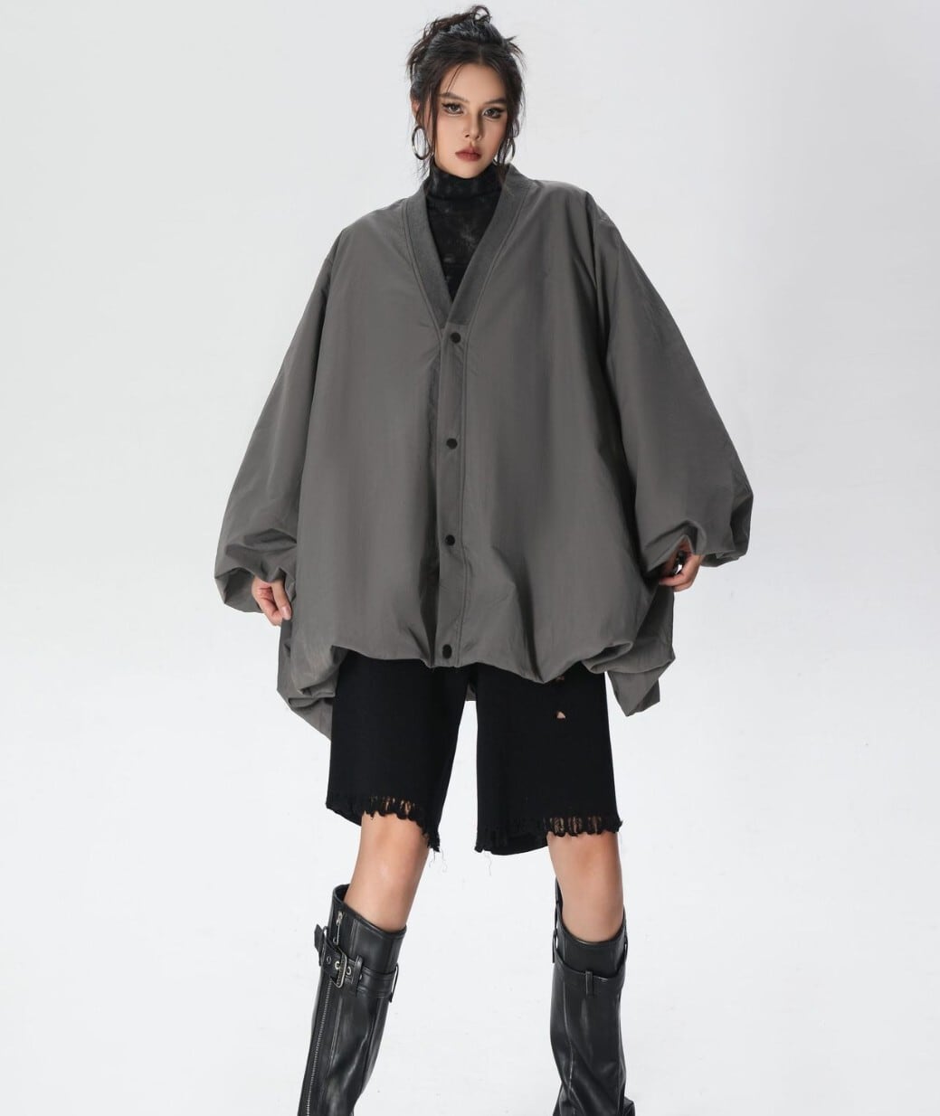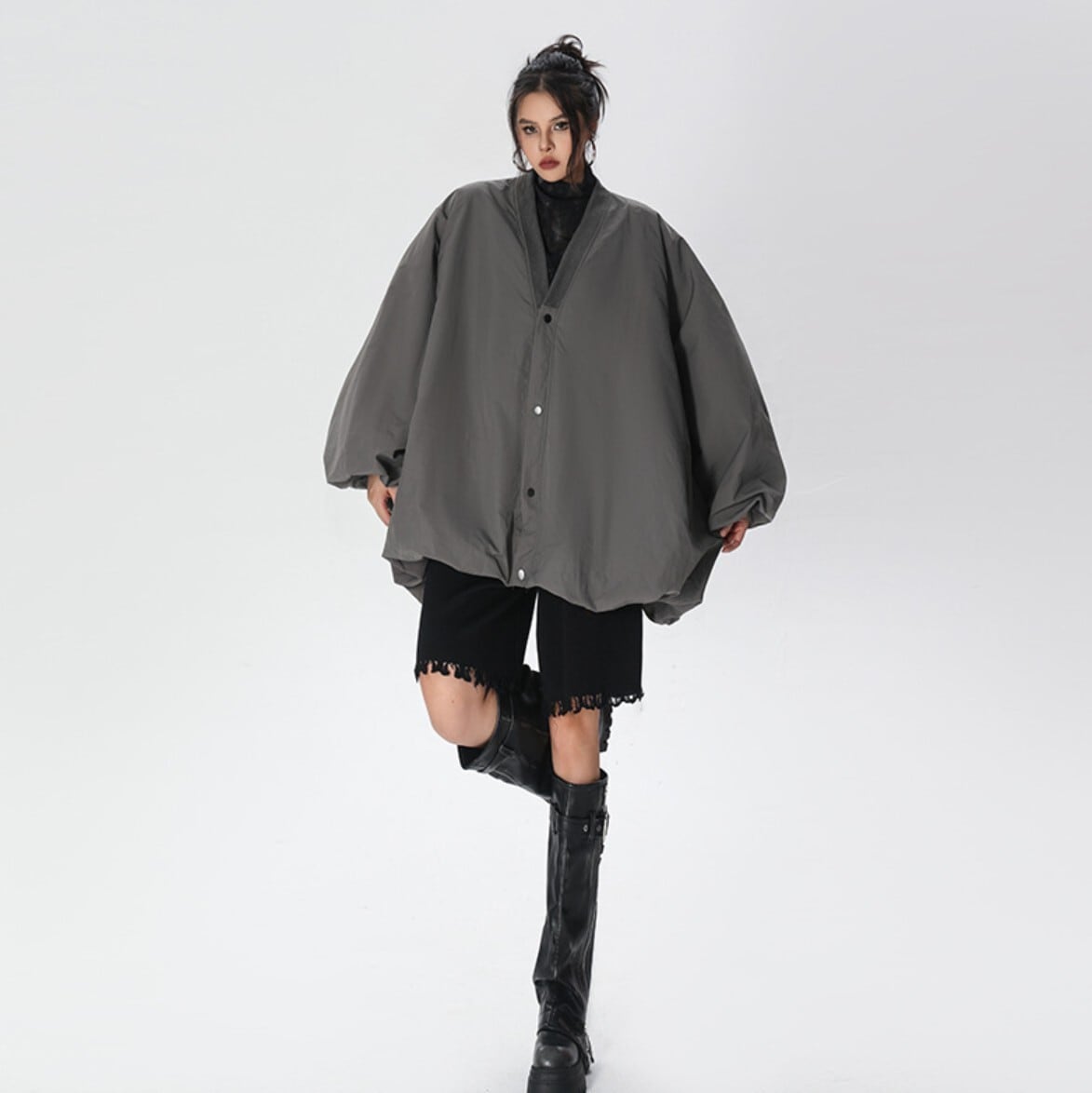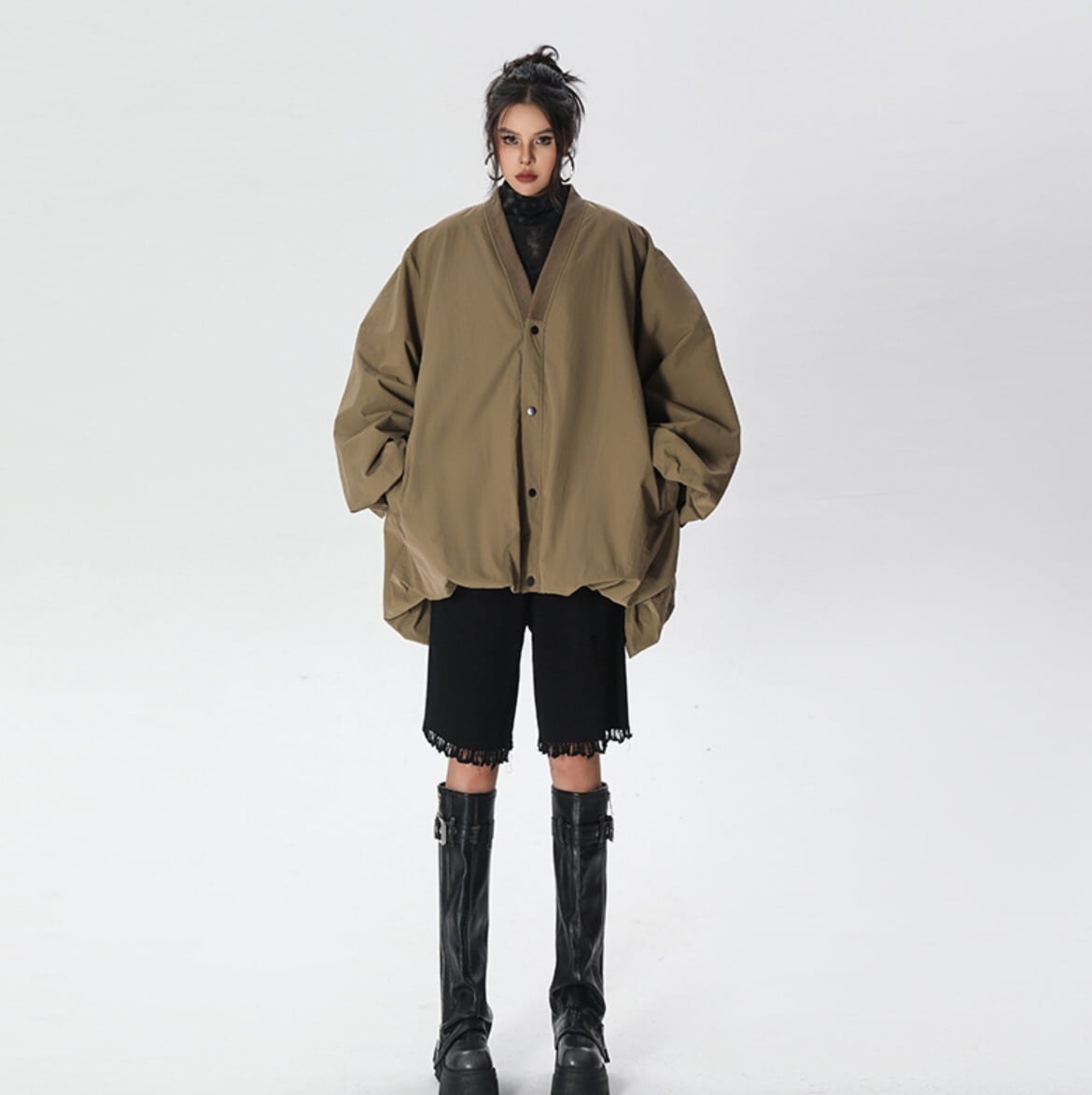 #韓国系 #韓国ファッション #ジャケット #ウィンドブレーカー #ライトアウター #春アウター #秋アウター #Vネック #オーバーサイズ #ビッグシルエット #コクーンシルエット #花苞スリーブ #ぽわん袖 #バルーンスリーブ #体型カバー #ゆったり #スナップボタン #モード #ストリート #カーキ #グレー #ブラック
