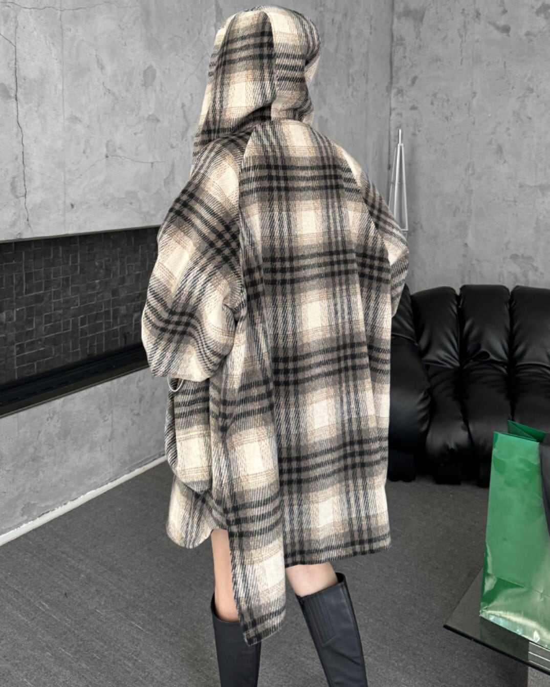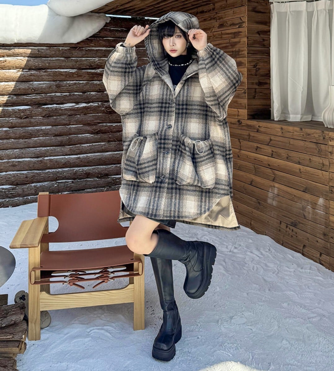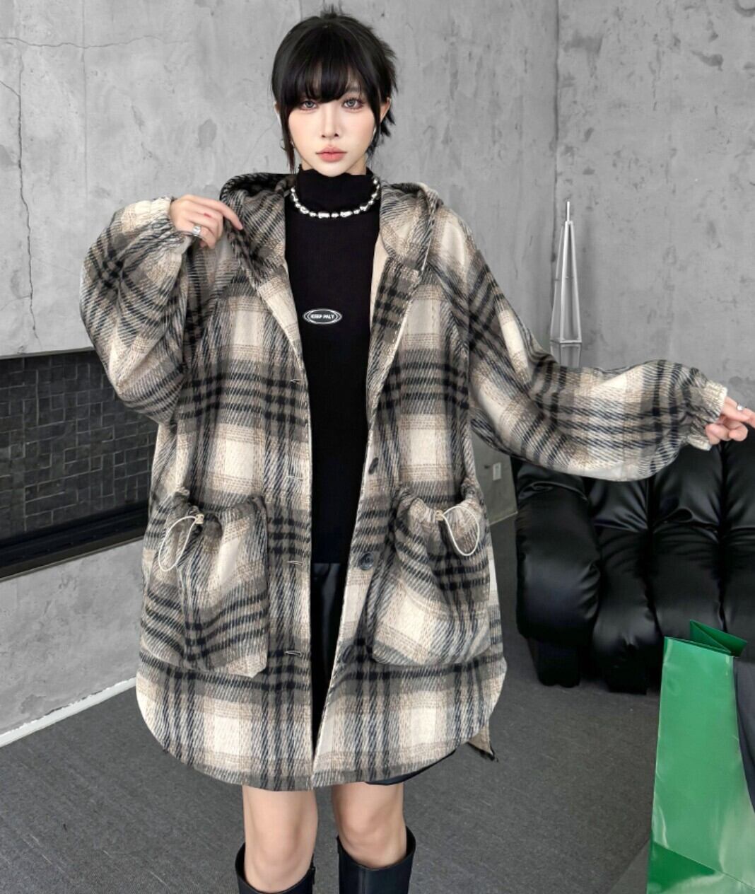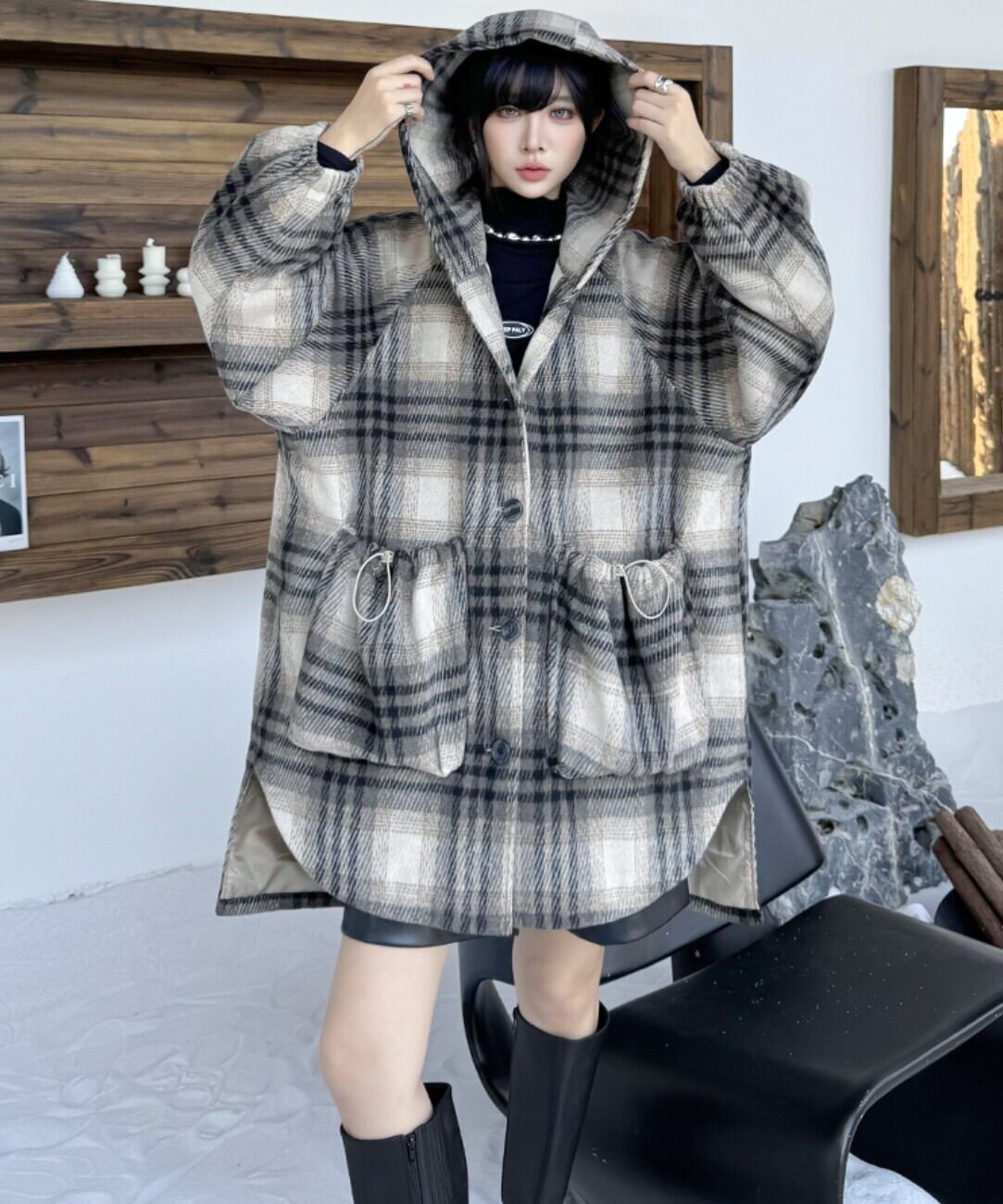 #コート #チェック柄 #フード付き #オーバーサイズ #ミドル丈 #ドロップショルダー #ビッグポケット #ドローコード風 #前開きボタン #体型カバー #秋冬 #ストリート #カジュアル #韓国系 #モード #ユニセックス風 #ヘムライン #ラウンドヘム #レイヤード向き #カーキ系