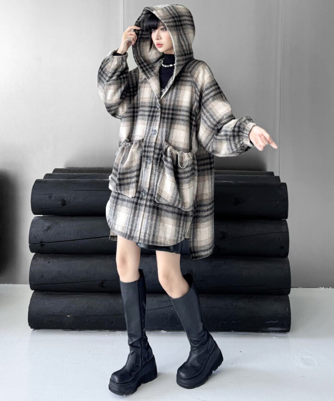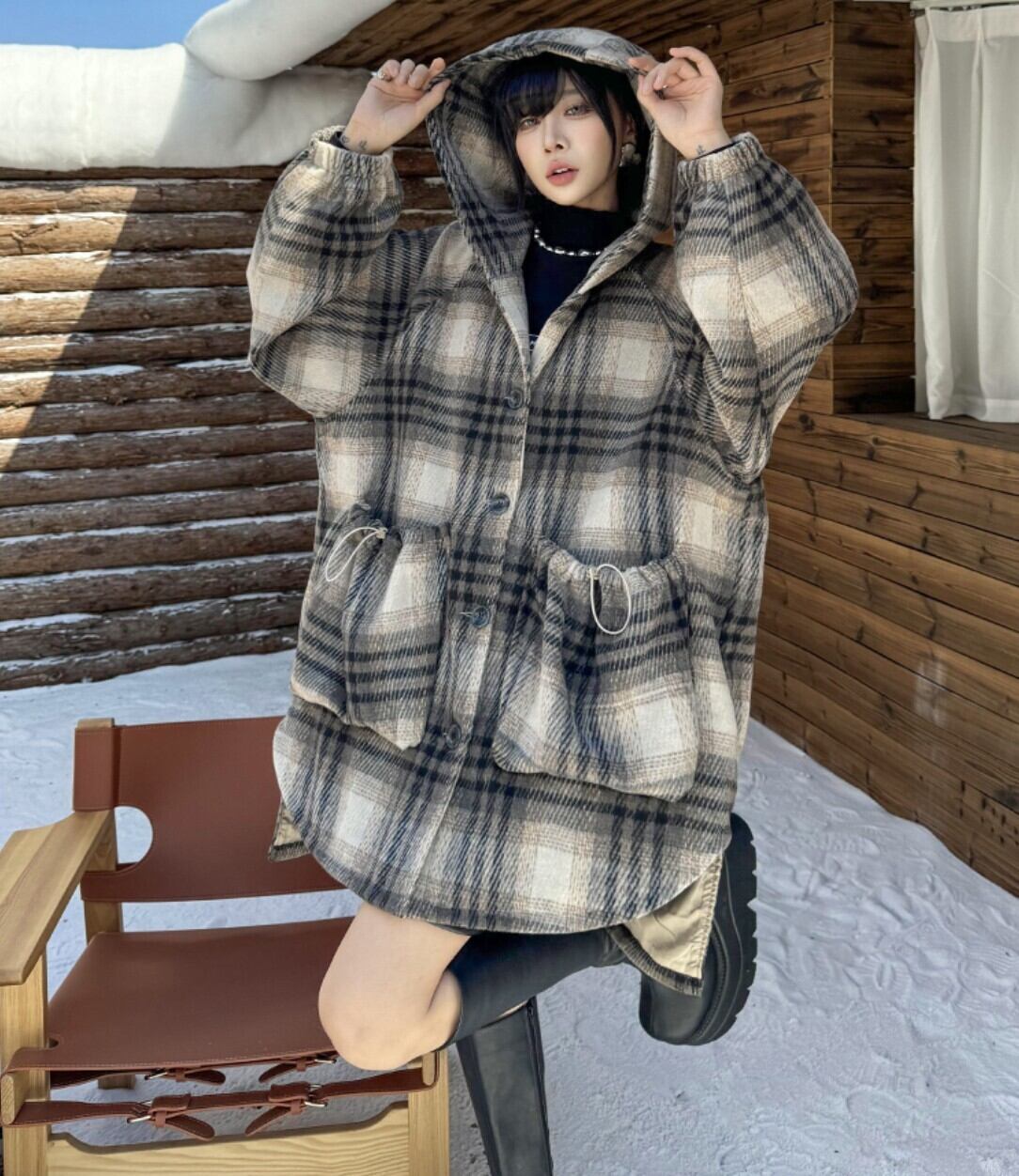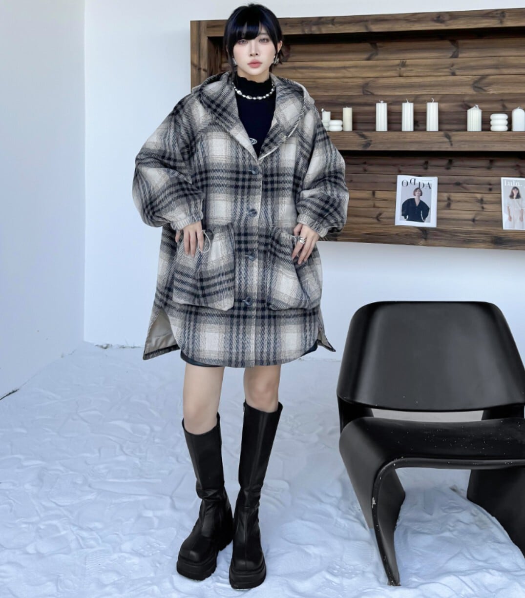 チェック×フード オーバーサイズ ミドル丈コート /レディース モード |NEIRA