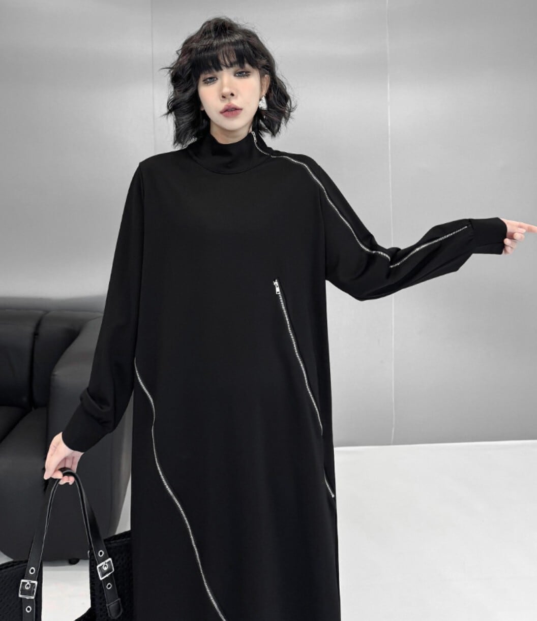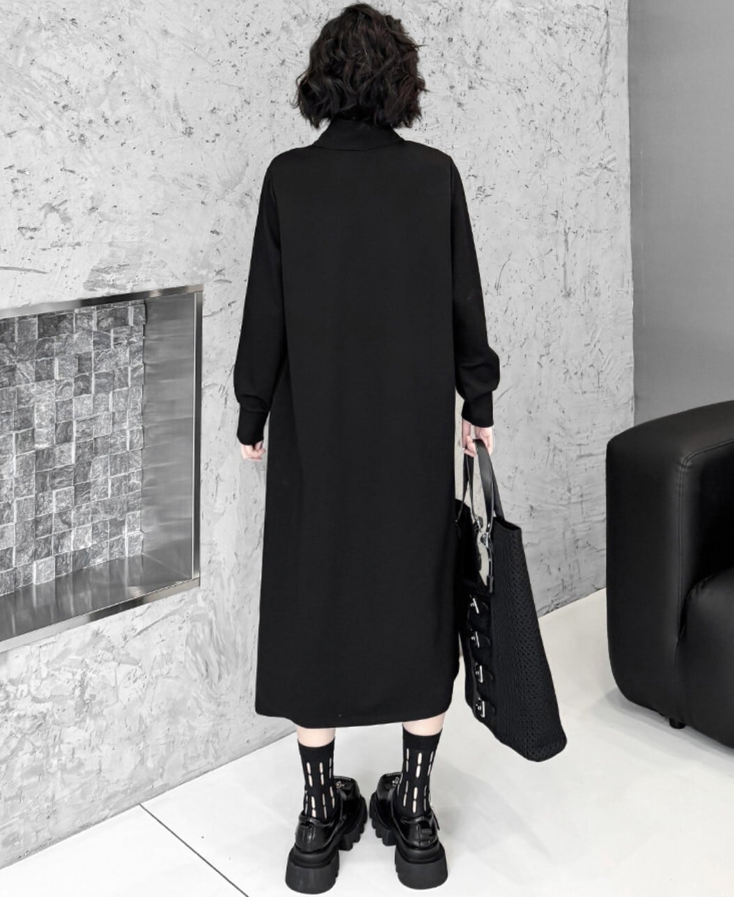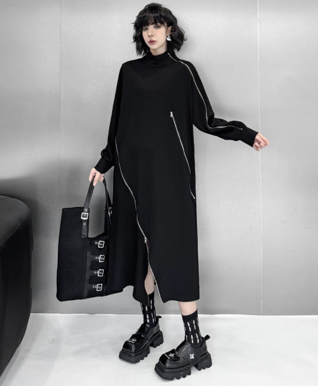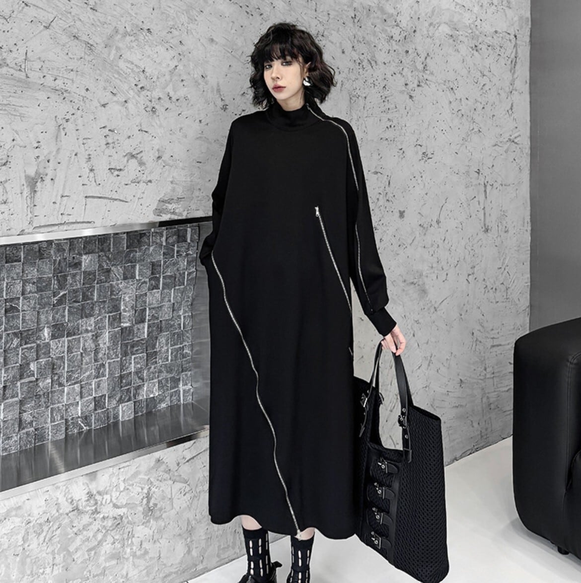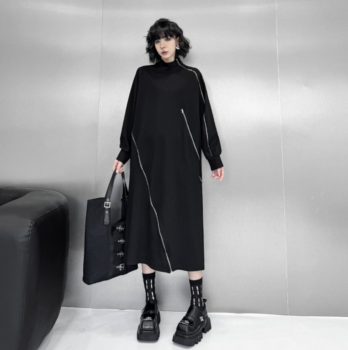 #ワンピース #ロングワンピ #ハイネック #斜めジップ #ジップデザイン #スリット #長袖 #ゆったり #体型カバー #モード #個性派 #山本風 #韓国風 #ブラック #黒 #春 #秋 #冬 #カジュアル #きれいめ #ミモレ丈 #マキシ丈