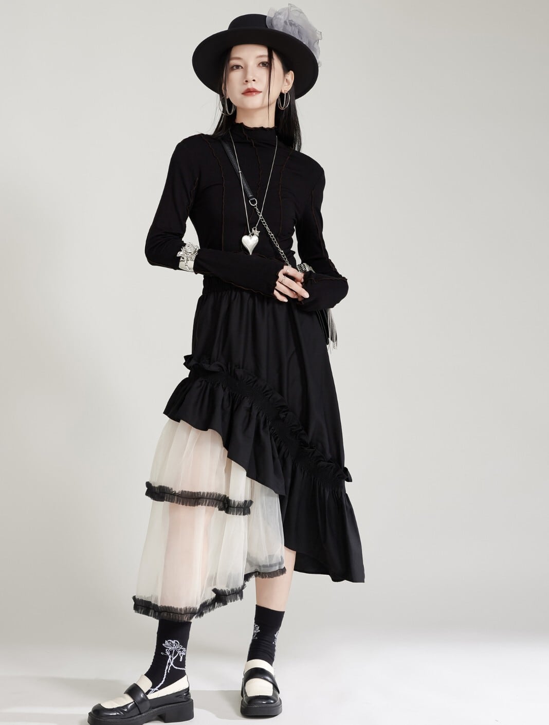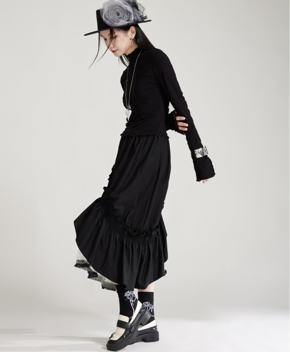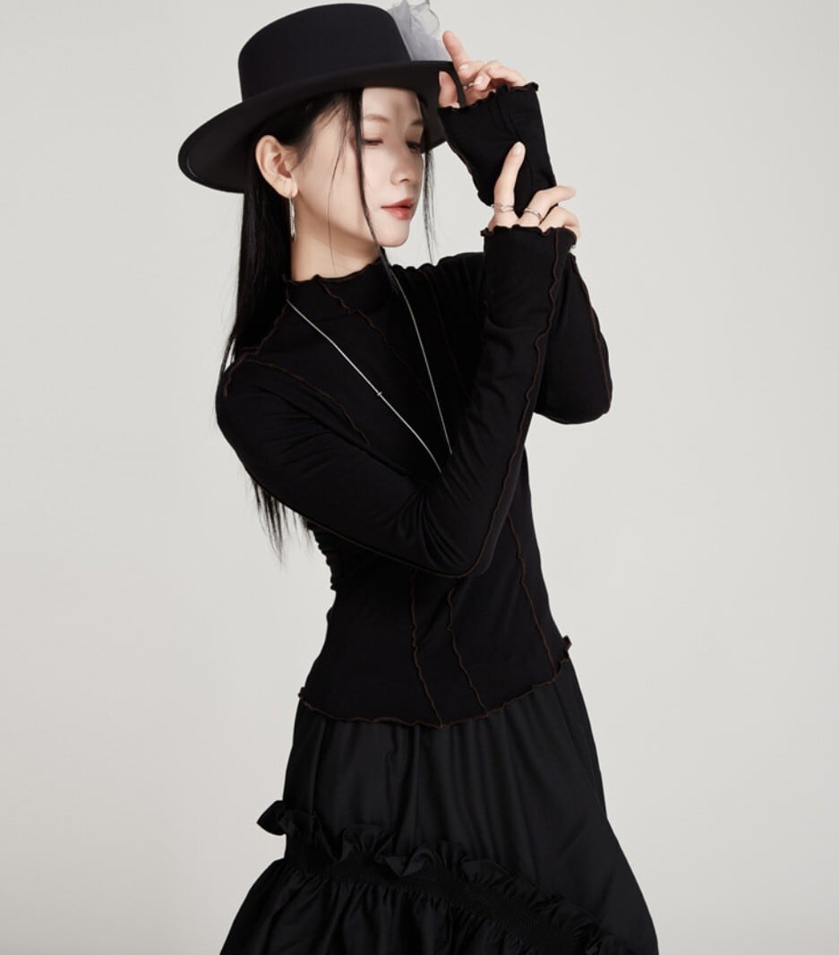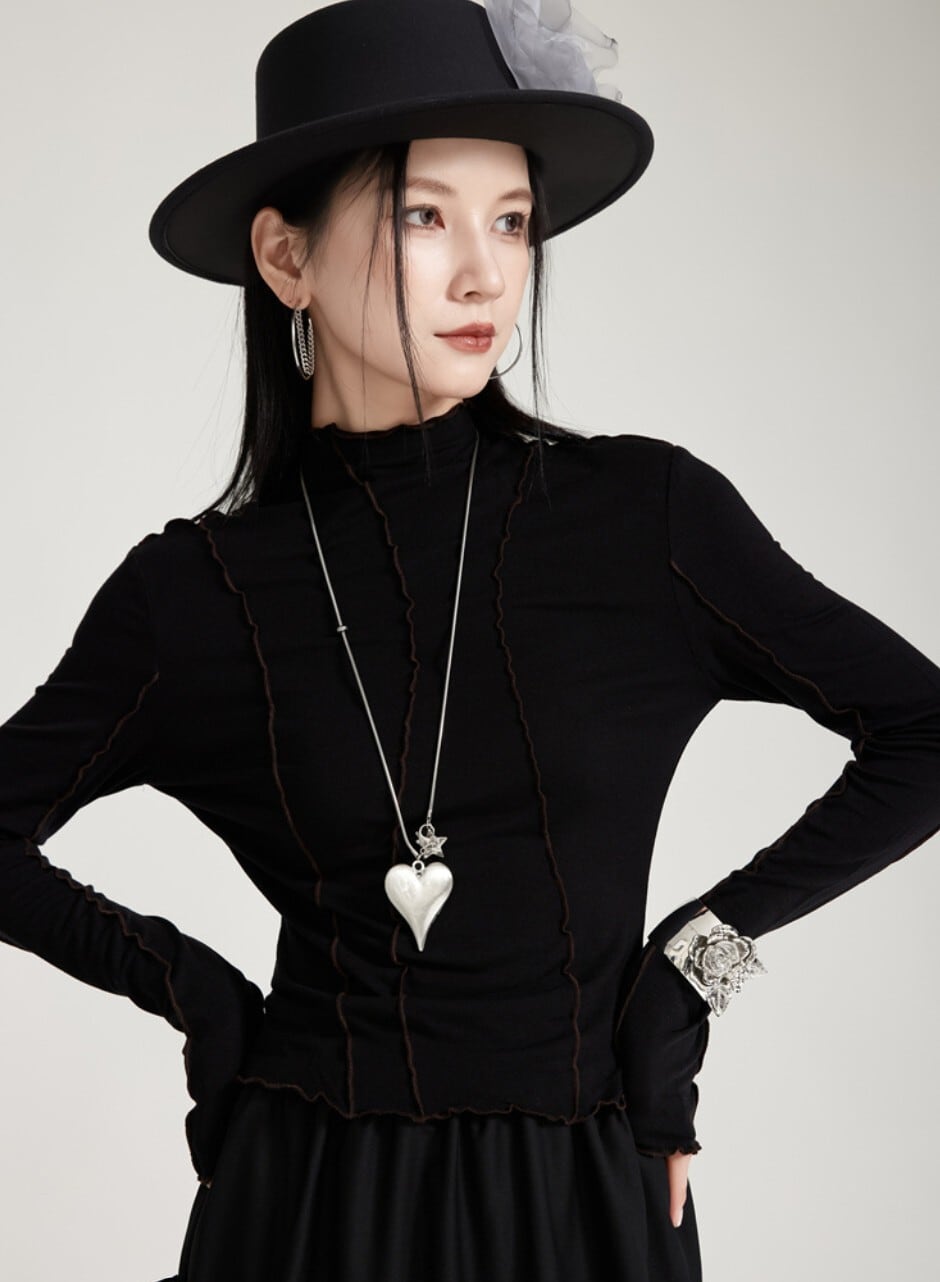 #メローステッチ #配色ステッチ #外縫い #モックネック #ロングスリーブ #スリムフィット #ストレッチトップス #韓国モード #ブラックコーデ #レイヤード