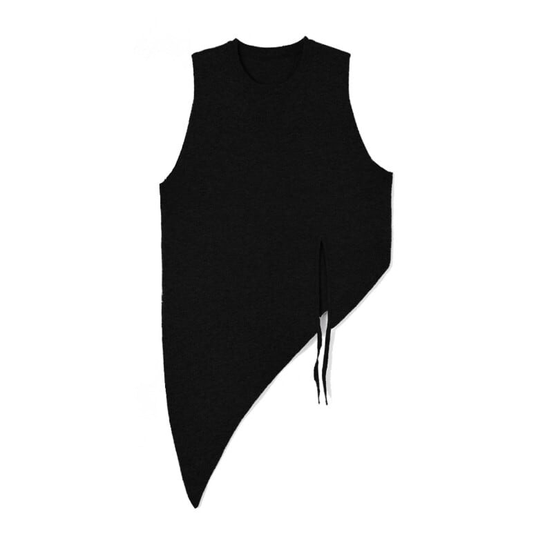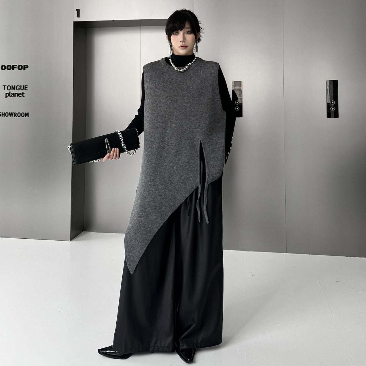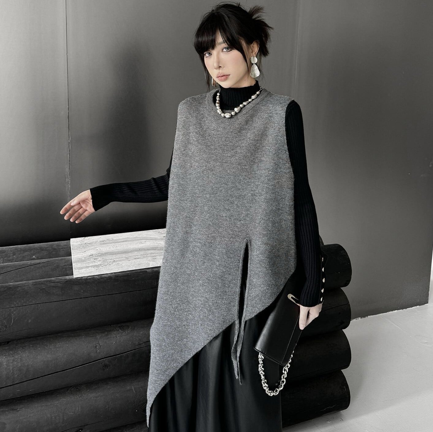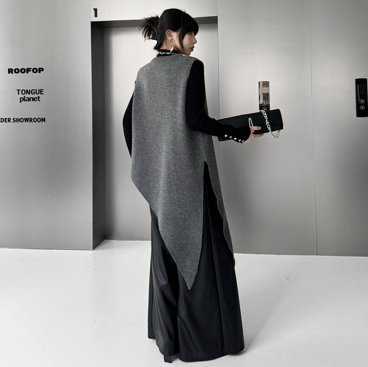 #アシメヘム #ロングニット #ノースリーブ #ジレ #サイドスリット #レイヤード #韓国モード #モードコーデ #グレー #ブラック