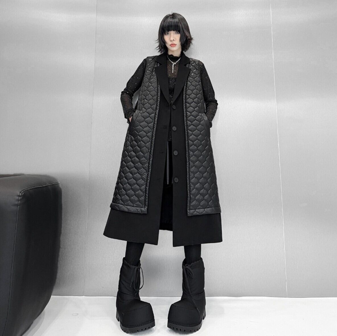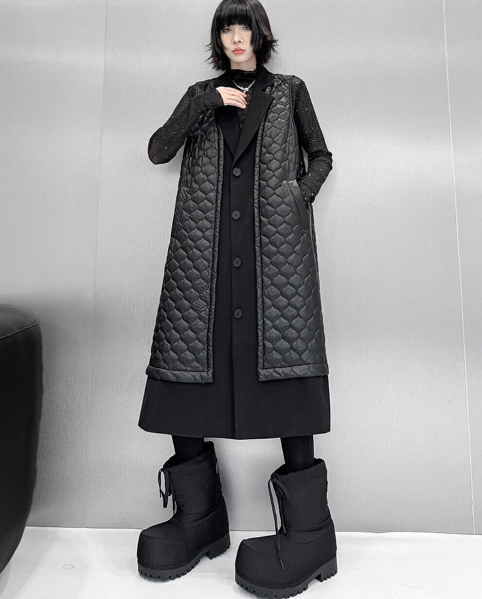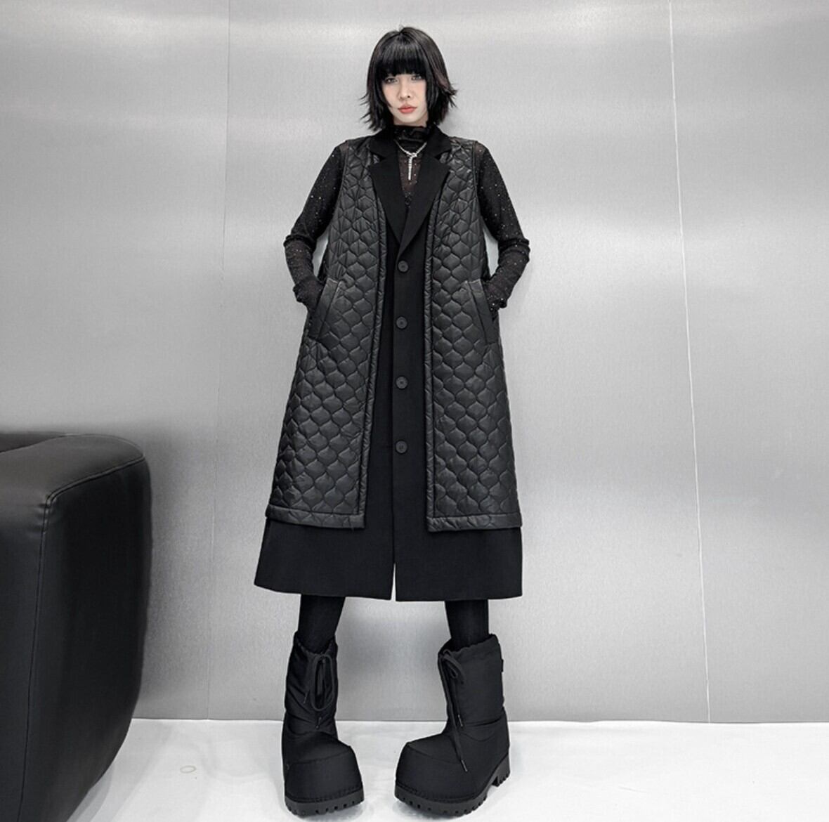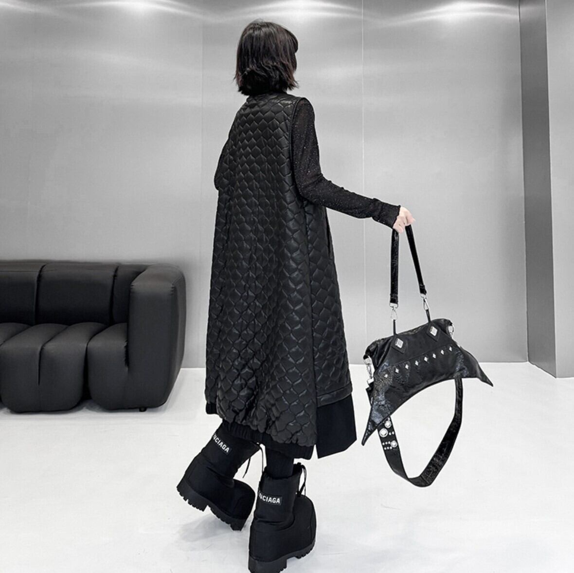 #NEIRA #ロングジレ #ロングベスト #キルティング #ダイヤキルト #中綿 #ソフトPU #合成皮革 #ブラック #モード系 #韓国系ファッション #テーラード #Aライン #Iライン #体型カバー #レイヤード #ポケット付き #秋冬アウター #ノースリーブアウター